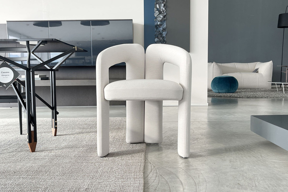 La chaise Dudet de Cassina naît d'une idée de Patricia Urquiola, qui en 2021 réinterprète avec un regard contemporain les atmosphères des années Soixante-dix. La designer espagnol donne vie à une petite architecture organique, composée de trois éléments rembourrés : un coussin de siège et deux tubulaires qui dessinent, en un unique geste fluide, des pieds, accoudoirs et dossier. Les lignes douces et le profil continu rendent la chaise Dudet un objet au fort caractère visuel, capable de réunir confort et personnalité dans n'importe quel contexte domestique ou contract.