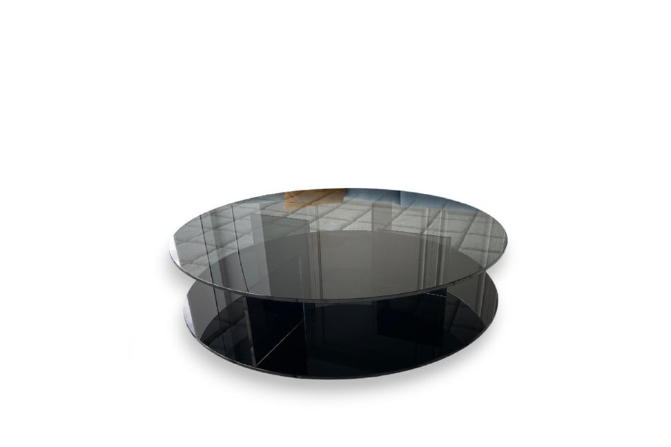 La table Mex en Offre Expo dans notre showroom est la version ronde de 106 cm de diamètre avec une structure en verre trempé fumé et une base en verre fumé laqué noir.