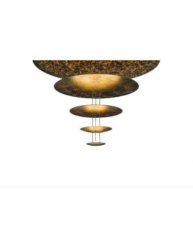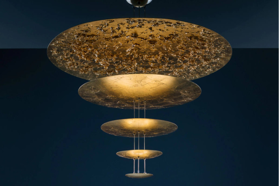 Parmi les éléments qui composent la ligne Luci d'Oro, conçue par Enzo Catellani de la même Catellani&Smith, se distingue Macchina della Luce, une lampe suspendue constituée de disques diffuseurs recouverts de feuille couleur or, cuivre ou argent, qui réfractent les rayons de lumière des ampoules LED en diffusant les tonalités de la couleur de la structure dans l'environnement et créant une atmosphère chaleureuse et accueillante. La lampe est réalisée en sept modèles différents qui varient en nombre et en disposition des disques le long des câbles en laiton ou en aluminium. Le premier disque le plus grand (Ø120 cm) est caractérisé par un raffiné revêtement en feuille libre qui confère dynamisme à l'ensemble de la structure.