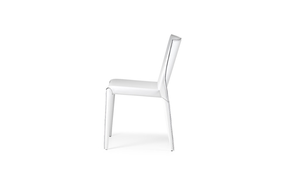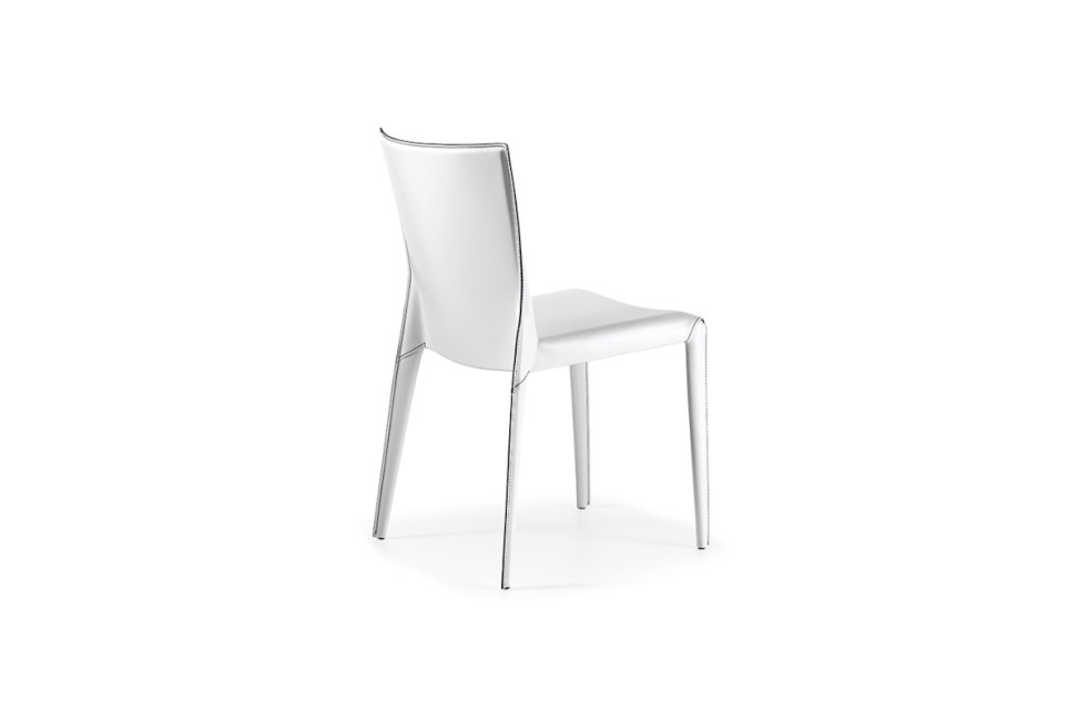 La chaise Beverly de Paolo Cattelan pour l'entreprise Cattelan Italia est un produit fabriqué en cuir et conçu pour s'adapter à chaque environnement de la maison. Elle est proposée avec une large gamme de revêtements en cuir de haute qualité. Le savoir-faire italien dans la production est évident dans les coutures visibles, assorties à la couleur du revêtement, et dans les lignes précises du dossier. La chaise présente une structure en acier entièrement recouverte de cuir, en cohérence avec les échantillons proposés.