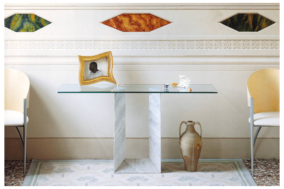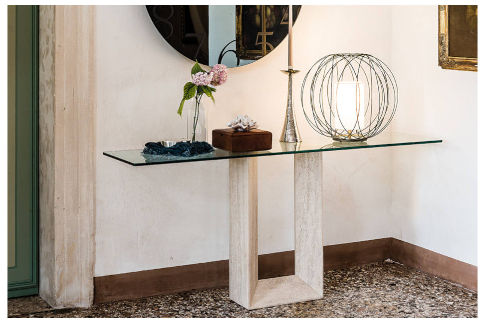 La console Diapason, réalisée par Cattelan Italia, présente une base en travertin ou en marbre blanc de Carrare et un plateau en cristal transparent. Elle est disponible en différentes formes et tailles.