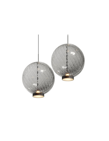 Grâce au savoir-faire de Oriano Favaretto et à l'attention artisanale des maîtres verriers de Murano, Cattelan Italia introduit dans sa collection de luminaires la lampe suspendue Ohay, résultat d'un moule en métal qui confère un motif tridimensionnel unique : des losanges entrecroisés qui s'entrelacent harmonieusement. Pendant le processus de soufflage, les pointes contenues dans le moule modèlent le verre fondu, créant l'effet facetté caractéristique du travail à balloton. L'effet optique qui en résulte est tout simplement spectaculaire, et est encore accentué par les ombres du cristal fumé. La lumière qui se reflète entre les ondulations régulières de la sphère restitue une atmosphère douce et délicate, créant une expérience visuelle unique et immersive. Le bord de l'abat-jour de la lampe suspendue Ohay est entouré d'un élégant anneau métallique, qui semble presque vouloir retenir un ballon prêt à s'envoler. Ce détail souligne la grandeur du travail manuel du verre, qui parvient à le rendre léger et à lui conférer une âme séduisante, à un matériau autrement froid et rigide.