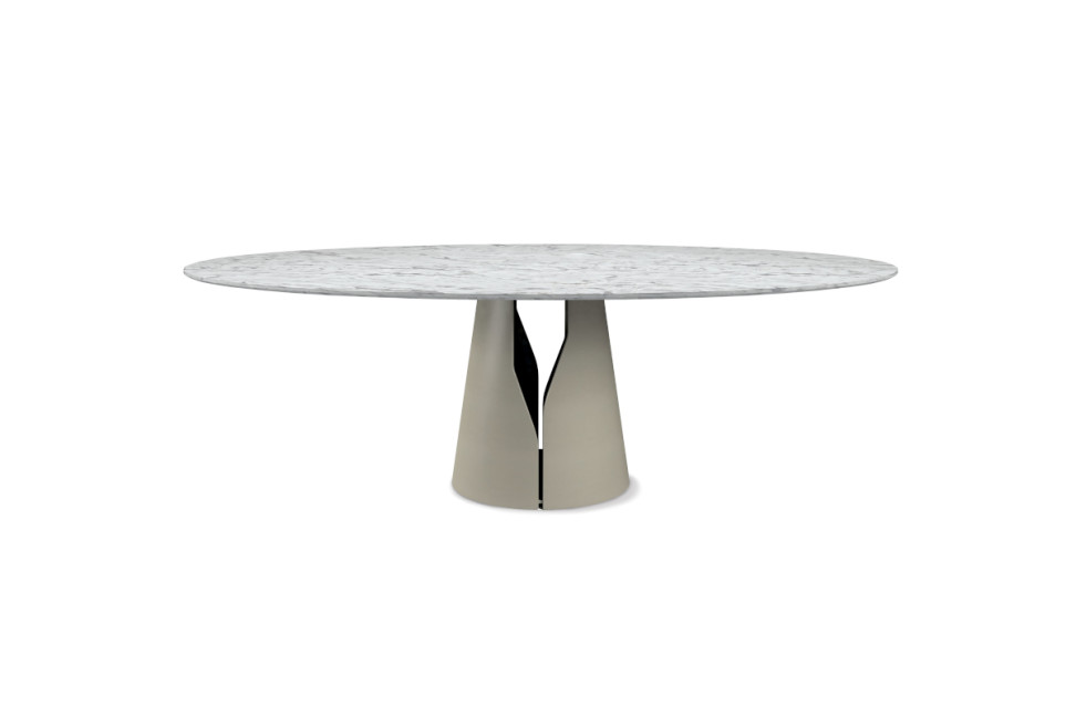 La table Giano conçue par Manzoni et Tapinassi pour Cattelan Italia est disponible en différentes variantes, dimensions et matériaux : dans sa forme standard, elle se présente comme une table moderne ronde ou ovale, avec des plateaux disponibles en bois ou en marbre. Giano CrystalArt représente quant à elle une table rectangulaire en verre, également sculptée, avec un fascinant motif artistique décoratif.