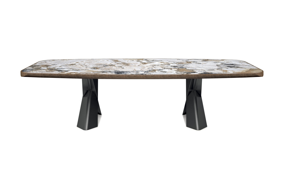 La table Mad Max, conçue par Paolo Cattelan pour sa propre entreprise, se caractérise par une base en acier qui prend la forme de deux X parallèles et soutient le plateau dans les variantes luxueuses disponibles : Mad Max Wood ou Masterwood, Mad Max Keramik et Mad Max Keramik Premium, et enfin, Mad Max Crystalart, qui offre un plateau en cristal de 12 mm ultratransparent avec une décoration artistique imprimée en deux nuances de couleur différentes.