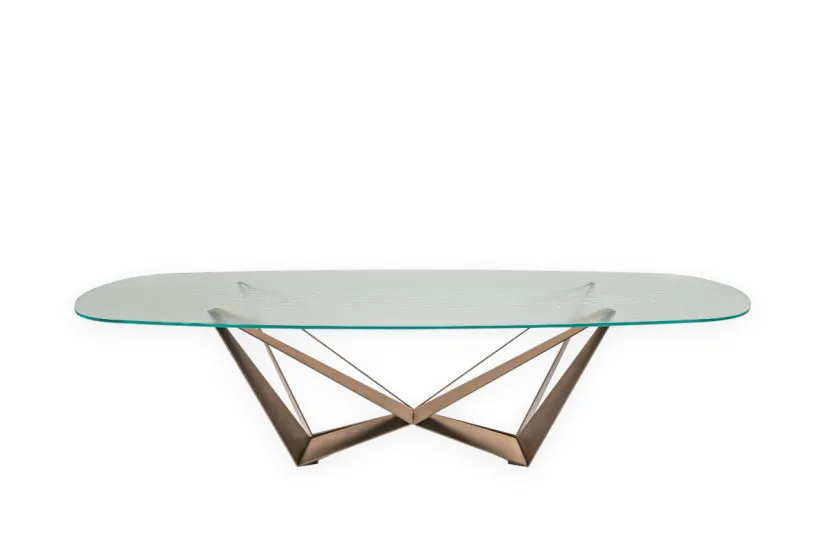 Caractéristiques Techniques: La base de la table Skorpio est réalisée en acier peint avec une finition gaufrée, ou dans les versions brossées avec un traitement artisanal spécial qui détermine la singularité du résultat. Le plateau est en verre d'une épaisseur de 15 mm dans les versions standard, réduite à 12 mm dans les formats 160x90, 182x90 et 200x106. Le plateau repose sur la base.