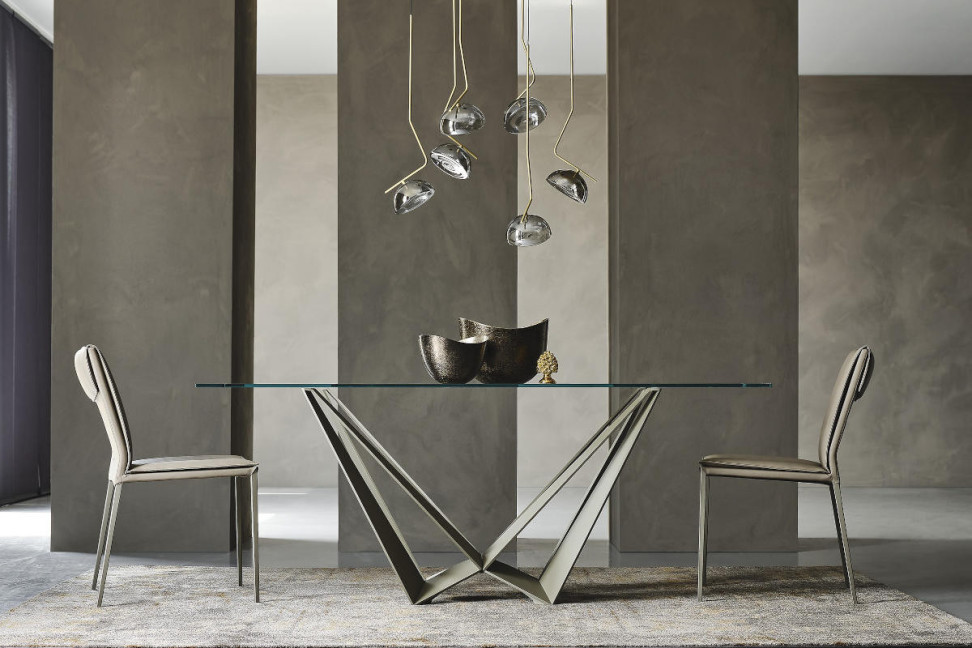 La table Skorpio de Cattelan Italia, conçue par Andrea Lucatello, est la table à manger la plus populaire de toute la collection de la marque italienne: sa base en acier à motif géométrique entrelacé évoque les pinces d'un scorpion et crée un jeu de reflets lumineux qui transforme chaque salle à manger en un espace au caractère visuel fort.