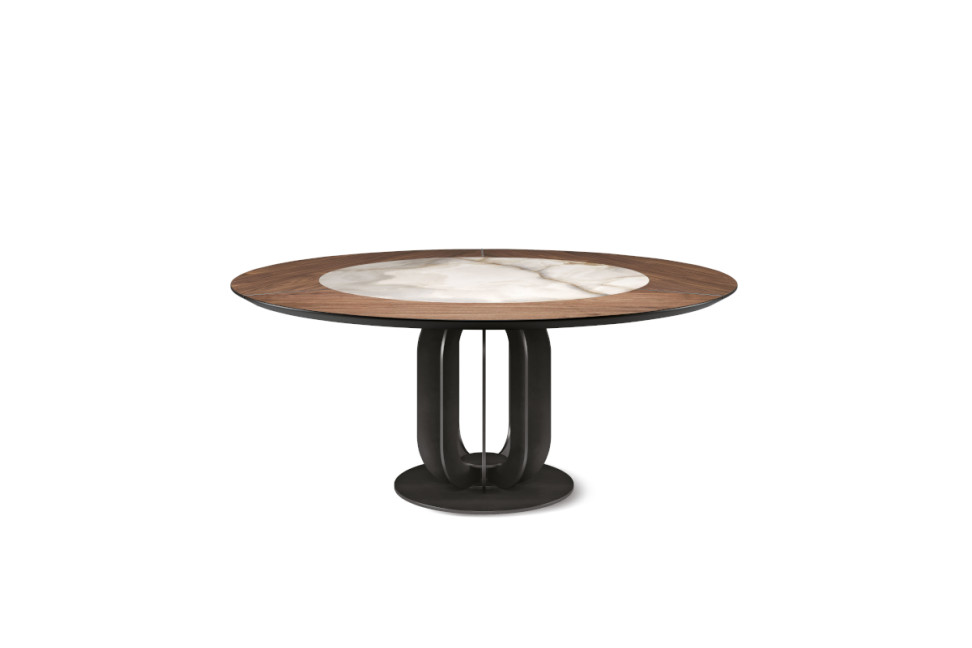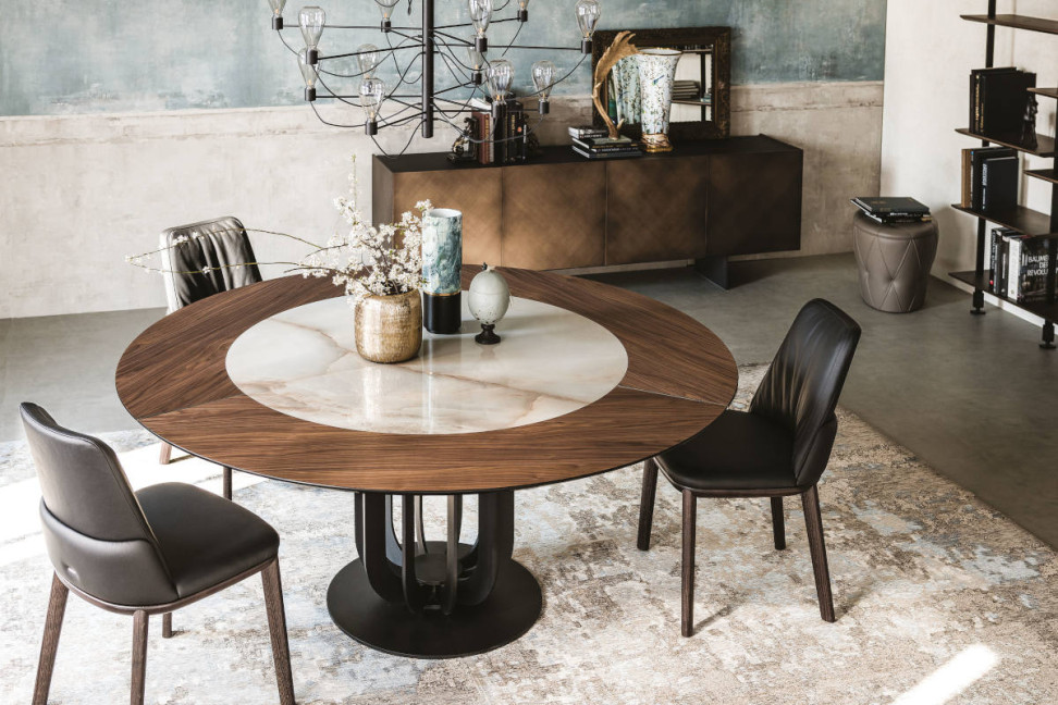 De la nouvelle ligne de Cattelan Italia, signée par les designers du studio Brogliato-Traverso, fait partie également la table Soho Ker-Wood, un complément de mobilier qui se distingue par sa base ovale perforée verticalement. Cet objet de design raffiné, adapté à tout type d'environnement, est le parfait mariage entre des matériaux de haute qualité : Soho Ker-Wood présente une base en acier peint texturé graphite, titane ou noir, sur laquelle repose un plateau en bois en noyer Canaletto ou chêne brûlé avec insert en céramique Marmi, disponible dans les nombreuses finitions de la collection Cattelan Italia.