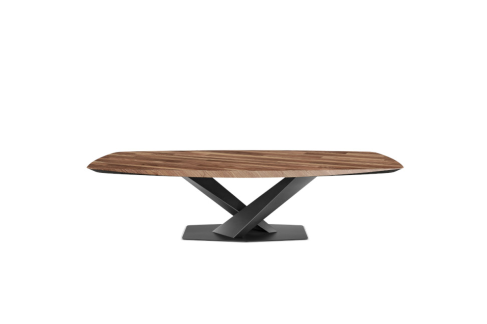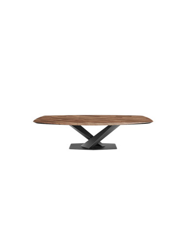 La table Stratos Wood, conçue par le Studio Kronos pour Cattelan Italia, attire immédiatement le regard grâce à son allure monumentale et élégante.