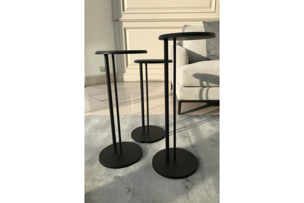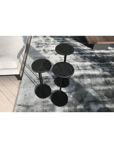 Set composé de n.3 tables basses avec base en acier peint texturé noir et plateau rond en marbre céramique Portoro mat.