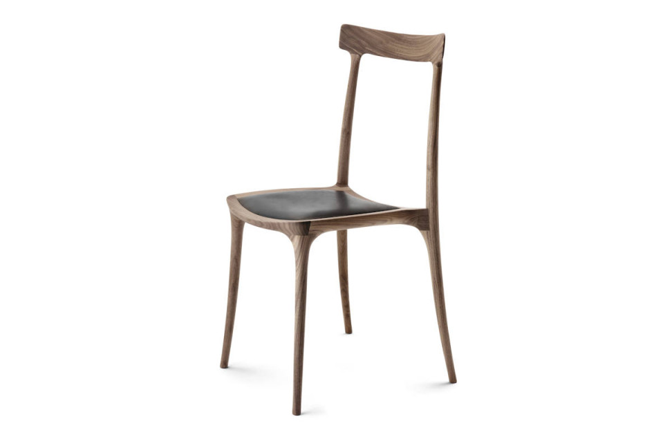 Les lignes de la chaise P.J. sont simples mais originales ; la structure est en bois massif de noyer américain et est enrichie par un siège en contreplaqué rembourré. Pour la structure, les finitions disponibles sont noyer naturel, noyer foncé, noyer moka et noyer marron, tandis que le siège peut être recouvert des cuirs et des tissus de la sélection Ceccotti Collezioni.