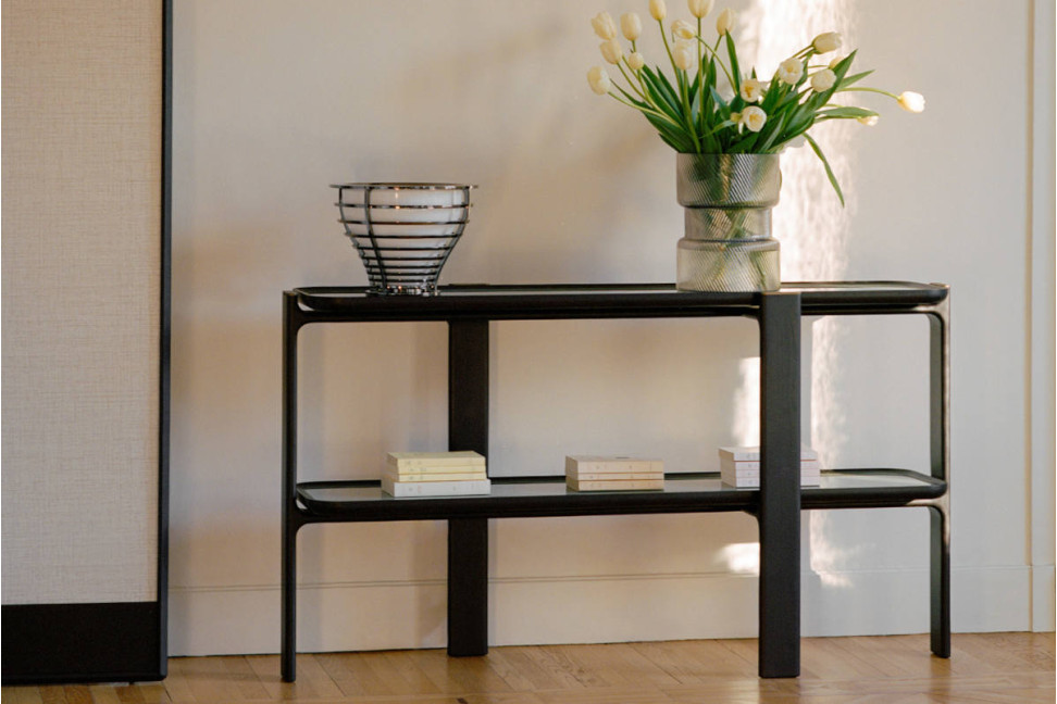 La consolle Duo est un élément de mobilier à l'approche architecturale, où la structure en bois massif de frêne avec des montants décalés est adoucie par les formes légèrement arrondies des plateaux, qui peuvent être en bois, en verre laqué ou en marbre. Le fond des plateaux est en contreplaqué de peuplier plaqué frêne de la même finition choisie pour la structure. Les détails métalliques avec finition bronze patiné apportent une touche supplémentaire de classe et de raffinement au design global.