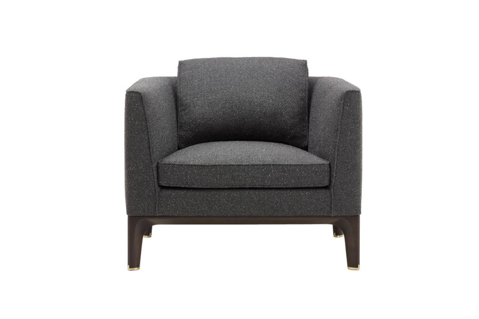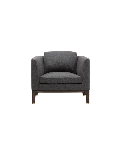La chaise D.G. aux lignes géométriques, présente une structure interne en multiplis et un socle en bois massif de noyer américain, proposé avec finition naturelle, moka, marron ou foncé. L'assise, les accoudoirs et le dossier sont rembourrés et peuvent être recouverts en tissu ou en cuir. La chaise D.G est également disponible dans la version canapé deux places, et est complète avec des coussins d'assise et des coussins de dossier, et finie avec des pieds en laiton.