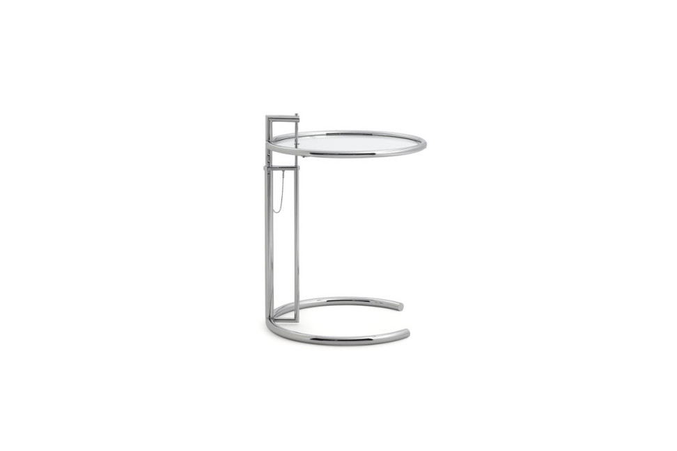 Le nom reprend celui de la maison où vivait la designer Eileen Gray avec son mari, justement la maison “E 1027”. Le design intemporel de ce table basse est caractérisé par une structure tubulaire en acier chromé qui, grâce à un mécanisme de blocage, permet de régler la hauteur du plateau, disponible en verre ou en métal peint en noir.