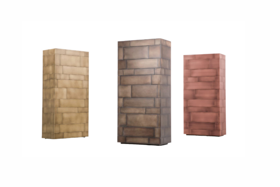 Depuis quatre générations, l'entreprise italienne De Castelli s'est spécialisée dans le travail des métaux, donnant vie à une collection unique. Le conteneur Celato du centre R&D De Castelli se présente avec une forme compacte et solennelle, un volume revêtu de métal qui cache de nombreux tiroirs internes, qui s'ouvrent avec une légère pression de la main. La structure et les intérieurs sont réalisés en bois de bouleau, et le revêtement en métal, tel une armure, enveloppe et donne du caractère à cet élément de mobilier. Le conteneur Celato est disponible en trois tailles, avec un revêtement en cuivre, fer, laiton et corten.