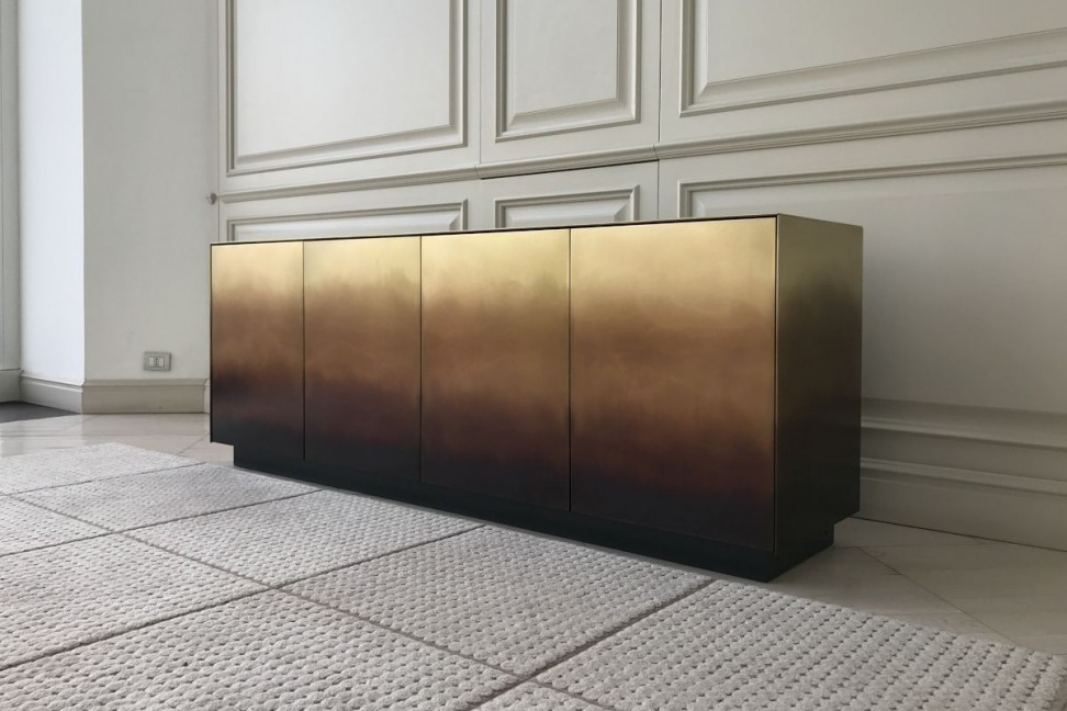 La meuble de rangement Marea en promotion dans notre showroom, présente une structure en laiton avec finition DeMarea et un plateau intérieur en chêne finition titane.