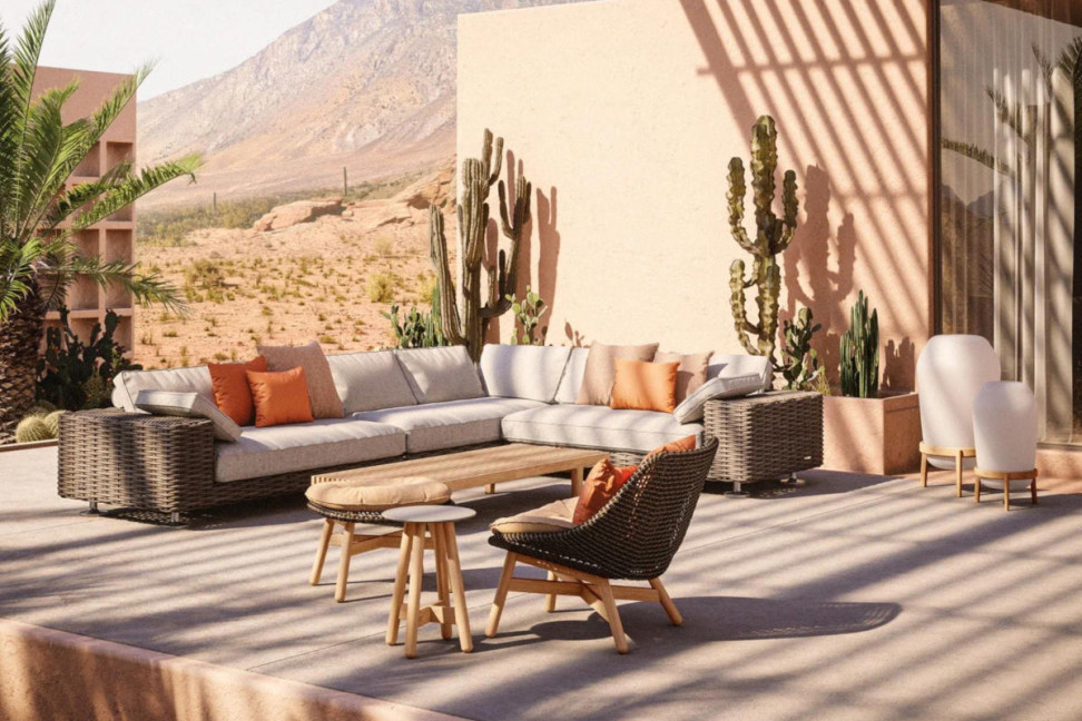 Conçue par Sebastian Herkner, Mbrace de Dedon est une collection originale et innovante, qui comprend un fauteuil, un rocking-chair, un lit de jour et un pouf.