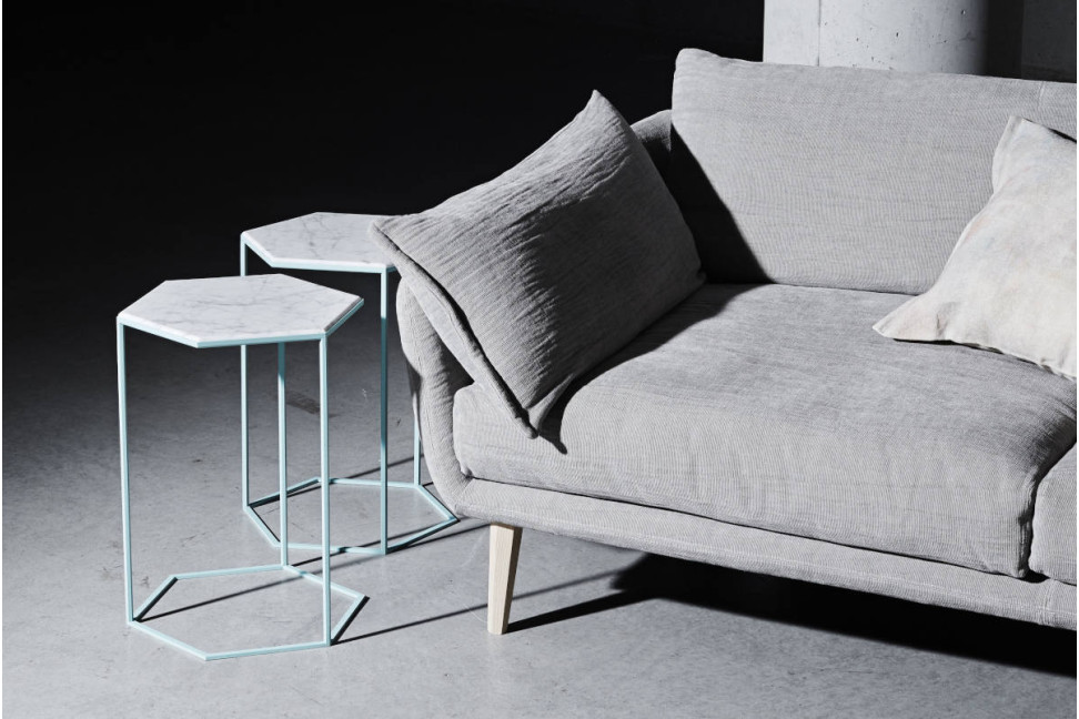 Présenté par Diesel with Moroso, cette table basse joue sur le contraste entre le solide plateau en marbre de forme hexagonale et la légère structure en métal. Le table basse Haxxed est à la fois classique et moderne, il peut être utilisé comme élément unique à côté d'un siège ou en composant un design original. Le table basse est disponible en deux hauteurs et en trois combinaisons de couleurs : cuivre vintage, cuivre brillant et noir mat, laqués en poudre, accompagnés de plateaux en marbre noir ou blanc.