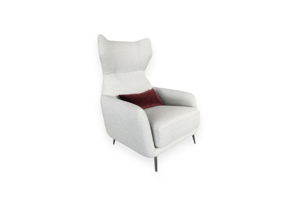 Le fauteuil Dufflè, en offre expo dans notre showroom, est caractérisé par un revêtement en tissu couleur glace et des pieds en métal teinté anthracite. Un coussin pratique pour les reins en tissu rouge bordeaux lui donne une touche de couleur.