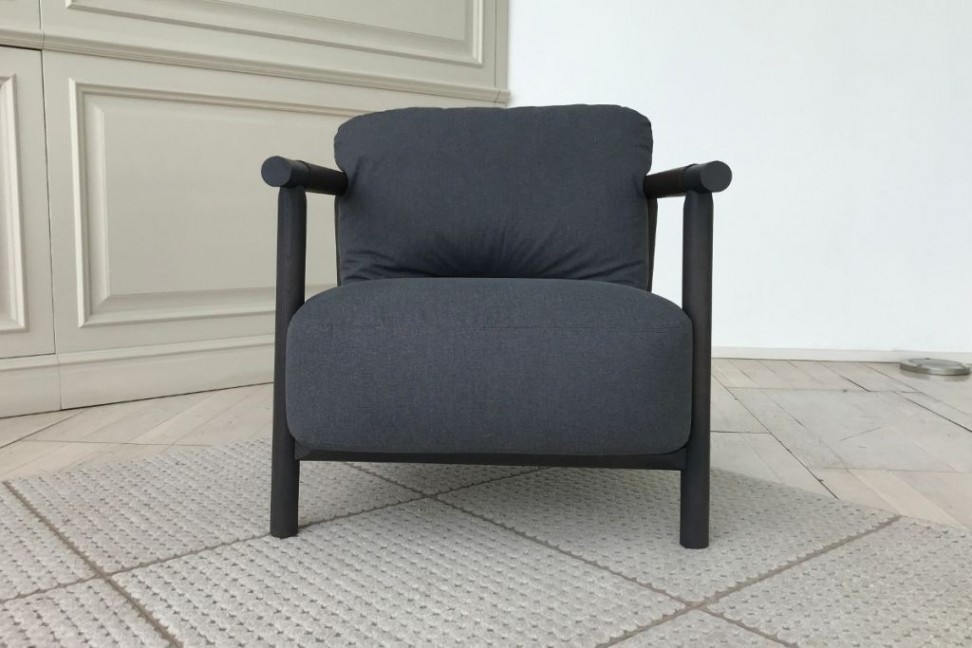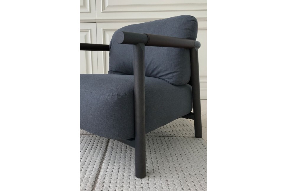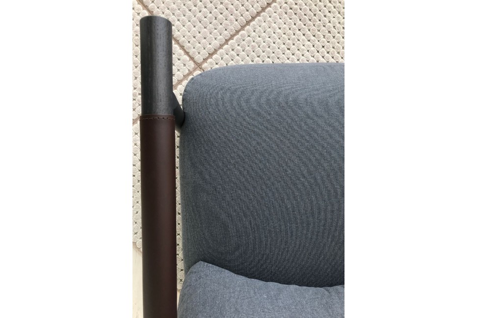 Le fauteuil Nathy en Offre Expo dans notre showroom est caractérisé par une structure en bois gris, un revêtement en tissu de couleur gris foncé et des inserts en cuir marron.