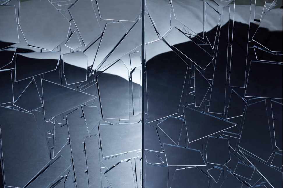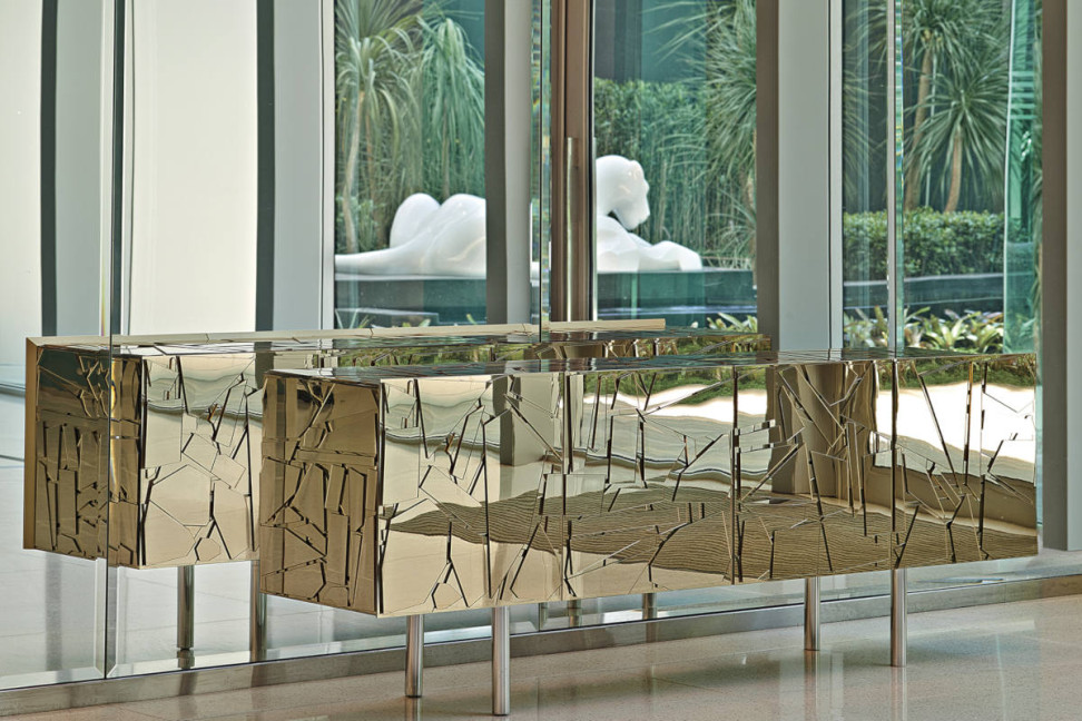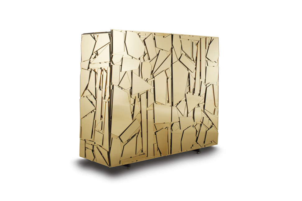 Caractéristiques Techniques: La structure du Scrigno est en bois, laquée avec des peintures métalliques et recouverte de formes en méthacrylate miroir Coloreflex, découpées au laser et appliquées à la main. Les portes à ailes cachent des étagères en bois laqué et en verre, tandis que les tiroirs glissent sur des rails à extraction totale. Le socle est en acier avec des pieds réglables ; dans certaines versions, des pieds en aluminium brossé brillant sont prévus.