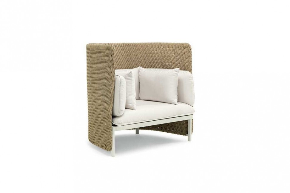 Caractéristiques techniques: La structure du fauteuil est en fibre de natwick de couleur sable. La fibre est tissée à la main pour créer un tissage semblable à celui du rotin, mais avec les avantages des fibres synthétiques. Le choix de ce matériau confère aux fauteuils un aspect naturel et sophistiqué, tout en offrant une résistance optimale aux intempéries, à la lumière intense du soleil et à l'usure du temps. Les coussins sont disponibles en blanc.