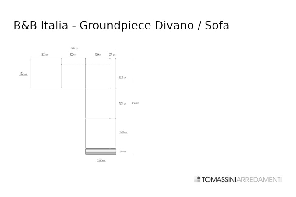Dimensions : cm. 386x122/346x56h (hauteur d'assise : cm. 40h).