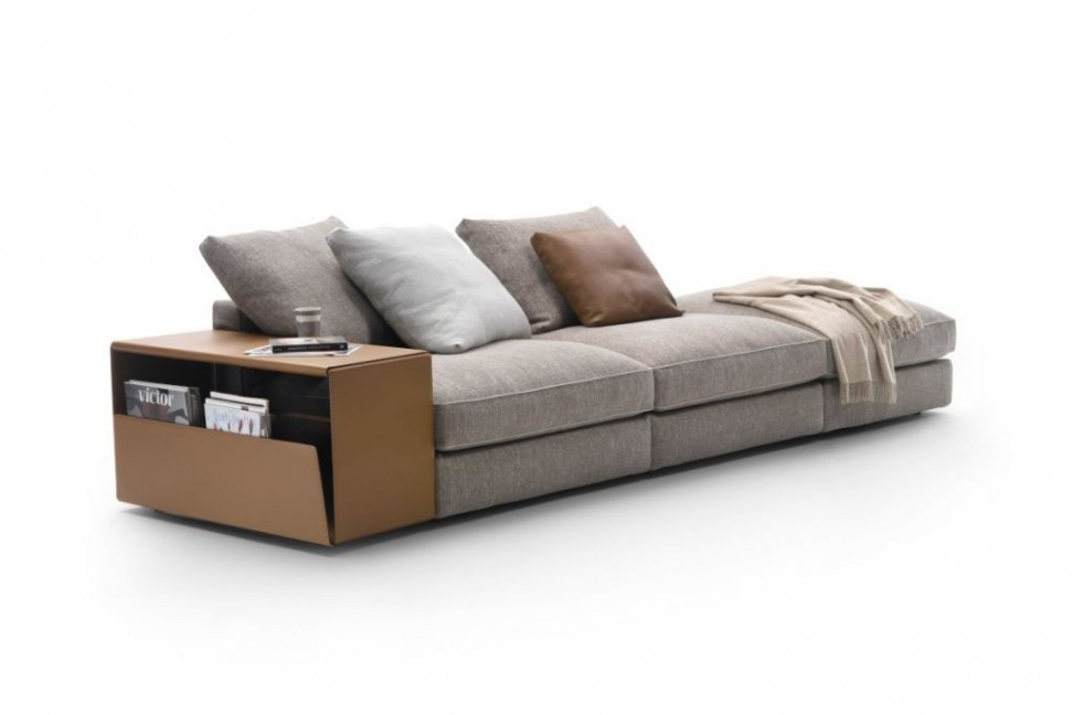 Le canapé Harper, nouveauté 2021 d'Antonio Citterio pour Flexform, a une forme harmonieuse et équilibrée et se distingue par l'embellissement apporté par les accoudoirs/conteneurs recouverts de cuir. Les accoudoirs peuvent en effet remplir la fonction de pratique espace de rangement, pour y mettre des plaids, des magazines, des livres, etc. Le canapé Harper est disponible en trois profondeurs – cm 99, cm 111 et cm 126 et les différents modules peuvent être combinés à volonté dans d'innombrables solutions différentes.
