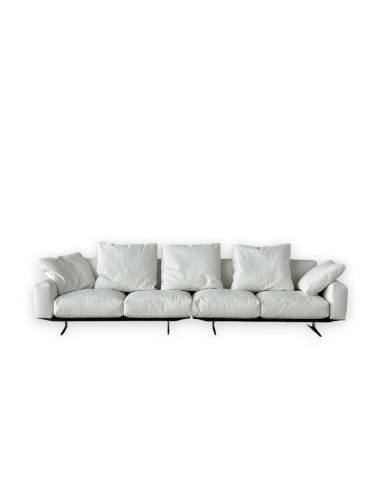 Le canapé Soft Dream présenté dans notre salle d'exposition est un canapé 4 places linéaire revêtu d'un cuir blanc élégant et raffiné. La structure, revêtue de cuir de haute qualité, est élancée, presque suspendue, grâce aux pieds en métal satiné qui donnent de la légèreté à l'ensemble.