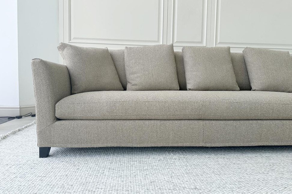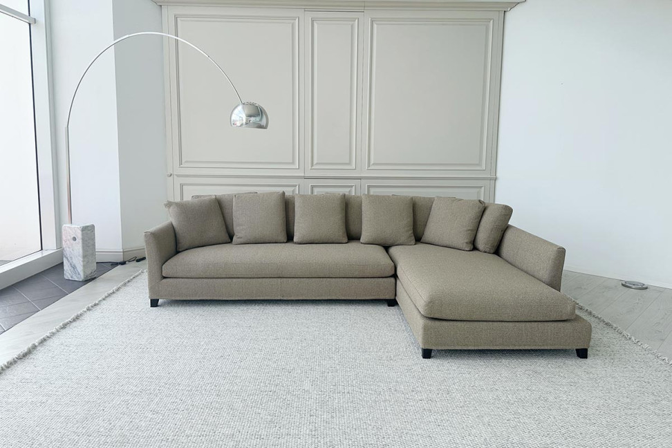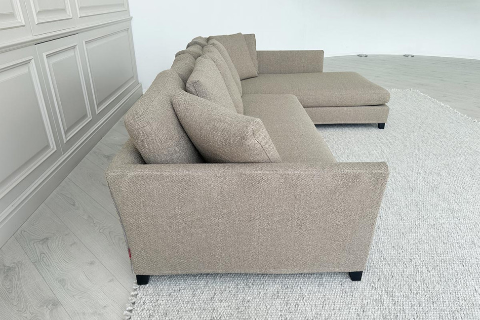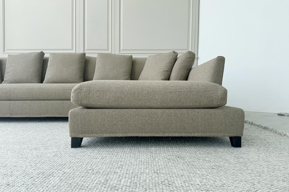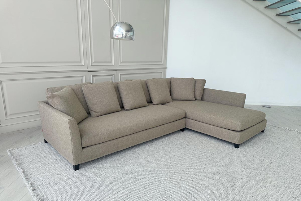 Le canapé Victor Large en promotion dans notre showroom se compose d'un module d'assise spacieux et d'une chaise longue confortable, recouverte d'un tissu doux dans un ton brun chaud. Un ensemble de coussins de dossier inclus renforce le confort, tandis que les pieds en frêne teinté ébène rehaussent l'élégance.