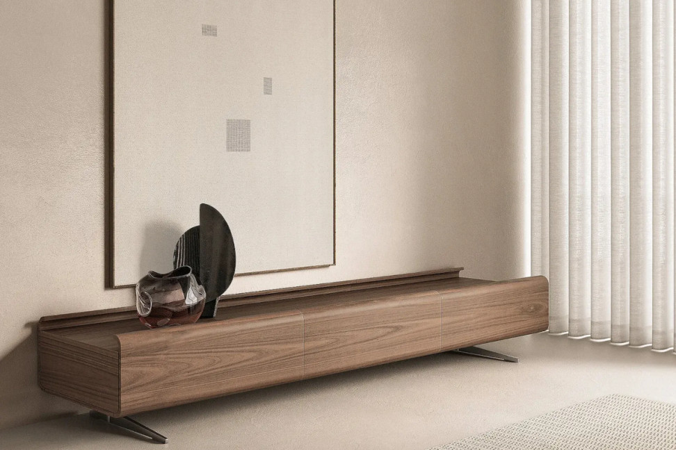 Cette nouvelle ligne de contenants, conçue par le designer Antonio Citterio, se compose de meubles différents tant dans les proportions que dans les destinations d'utilisation. Toute la famille est cependant unie par des lignes sobres et essentielles, ainsi que par la courbure particulière qui caractérise la partie supérieure du front des tiroirs et des portes plaquées en essences précieuses. Les meubles de rangement dans la version basse peuvent être embellis par un plateau en marbre, disponible en différentes typologies.