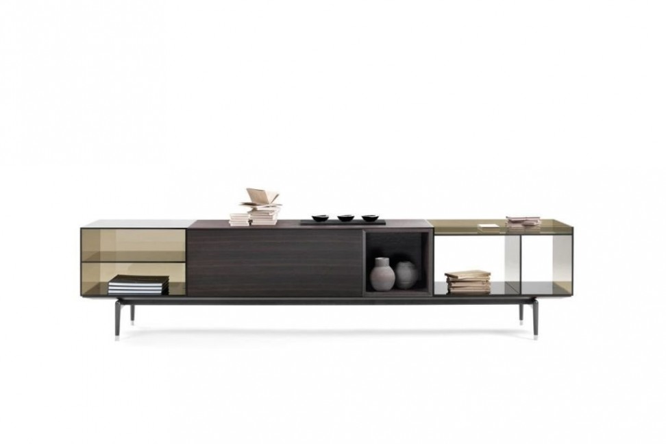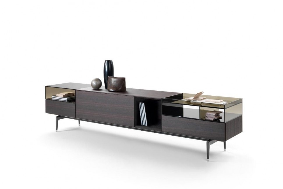 Les étagères internes en verre reprennent le style des parties transparentes externes, tandis que les pieds hauts élancent l'ensemble de la structure la rendant plus légère et proportionnée. La meuble de rangement, en outre, présente une finition des deux côtés, permettant ainsi de l'utiliser également comme élégant séparateur d'espaces et non seulement comme élément de décoration sur les côtés de la pièce.