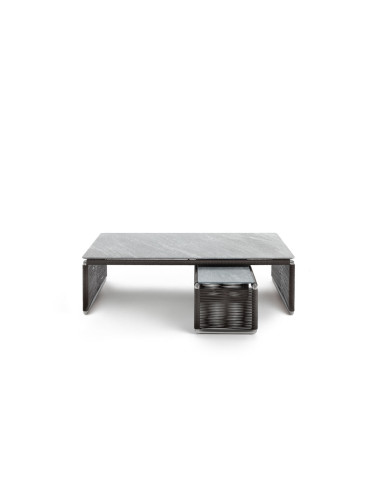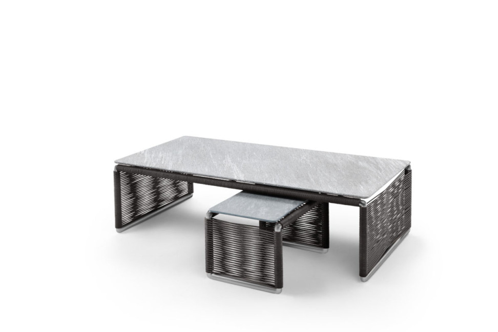 La structure en aluminium de Tindari de Flexform est enveloppée d'un tressage fait main en PVC ou en cordon en polypropylène disponible en six couleurs différentes, mettant en valeur le grand plateau rectangulaire. Ce dernier peut être réalisé en pierre lavique, Cardoso, Beola argentée ou Porphyre, laissant ainsi une large place à la personnalisation. Tindari est proposé en deux dimensions différentes parmi lesquelles choisir celle qui convient le mieux à vos besoins ou à combiner entre elles pour créer des compositions originales.
