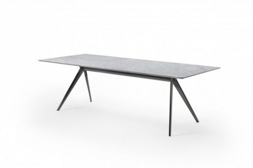 Cette table se caractérise par les lignes élancées des pieds en aluminium, disponibles avec une finition dans les couleurs blanc, vert kaki, rouge vin, brun et aluminium satiné ; pour le plateau, il est possible de choisir parmi la sélection des élégantes pierres pour extérieur de Flexform, à savoir Beola argentata, pierre du Cardoso, pierre volcanique et porphyre.