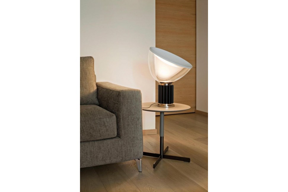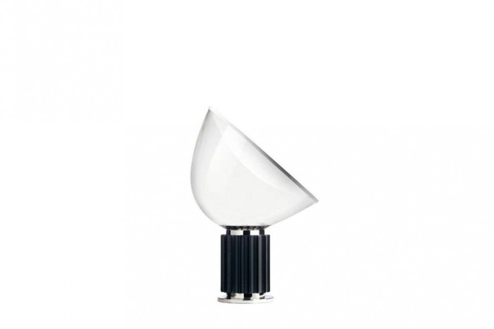 La lampe de table Taccia a été conçue en 1962 par les deux maîtres du design Achille et Pier Giacomo Castiglioni pour la marque d'éclairage Made in Italy Flos.Taccia présente une structure très particulière composée d'un diffuseur orientable en verre en forme de dôme, fermé par un réflecteur en métal peint en blanc qui émet dans l'environnement la lumière produite par le corps lumineux. Le diffuseur en verre est réalisé selon la méthode traditionnelle du soufflage à la bouche, tandis que le corps en aluminium peint en noir mat, anodisé argent ou bronze s'associe à une base en acier poli, nickelé et verni. La collection Taccia comprend deux autres modèles, l'un avec un diffuseur en matériau plastique et l'autre avec des dimensions plus réduites.