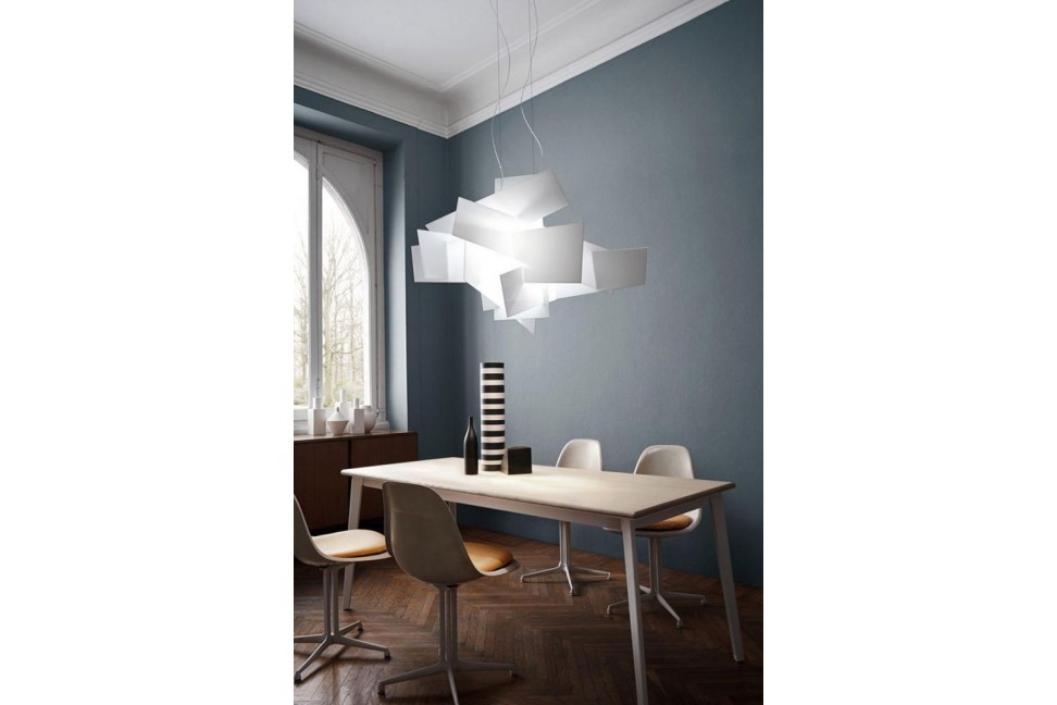 La lampe suspendue Big Bang est l'un des produits inclus dans les collections signées par la marque d'éclairage Made in Italy Foscarini.Big Bang naît d'un projet des designers Vicente Garcia Jimenez et Enrico Franzolini, qui ont réalisé une lampe au caractère explosif et percutant, caractérisée par une structure à 6 niveaux en méthacrylate translucide de formes différentes et une plaque en aluminium peint en blanc. L'intersection et l'interaction entre ces éléments confèrent de la dynamique à la structure. La lampe est dotée d'une lumière directe et diffuse qui enrichit l'environnement à travers un fascinant jeu de lumières et d'ombres à fort impact visuel. Big Bang, disponible dans la version blanche ou bicolore blanc-rouge, est fixée au plafond par le biais de deux câbles en acier inoxydable et un rosace en métal galvanisé revêtu de métal peint en blanc.