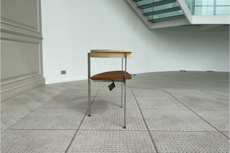 Le fauteuil PK11 en Offre Expo dans notre showroom est caractérisé par des pieds en acier satiné brossé, un dossier/accoudoirs en frêne laqué et un siège en cuir couleur cognac.