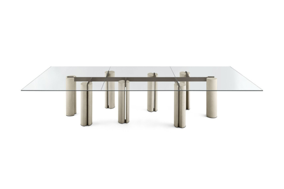 La table Simpòdio System, de Pinuccio Borgonovo pour Gallotti&Radice, est réalisée avec un plateau en verre trempé, disponible en extralight, “gris Italia” ou peint dans la finition exclusive bronze ancien ou plomb. La base est en béton allégé et disponible en couleur ivoire ou charbon, tandis que les parties métalliques sont laquées couleur boue. De plus, dans la version avec des dimensions plus grandes, la table peut présenter un plateau peint et deux extralight ou vice versa. La table Simpòdio System se distingue par la raffinement de ses lignes et par sa structure variée.
