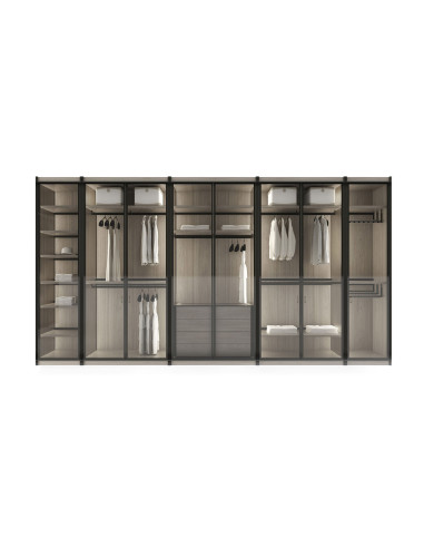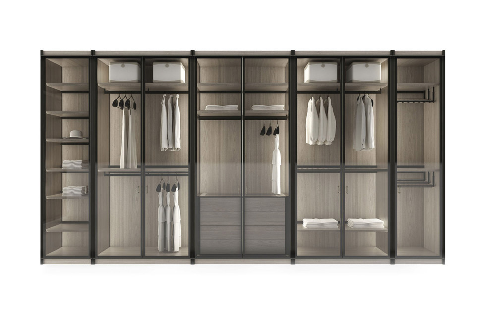 Jouant avec des matériaux de première qualité comme le bois de la structure, l'aluminium du cadre et le cristal fumé disponible pour les portes, Miyabi de Giorgetti se distingue par une personnalisation remarquable, grâce à la vaste gamme d'accessoires disponibles, y compris un système d'éclairage LED avec capteur d'allumage et d'extinction et télécommande. Disponible en deux largeurs et en deux hauteurs différentes, cette collection de placards est conçue pour s'adapter à chaque environnement.