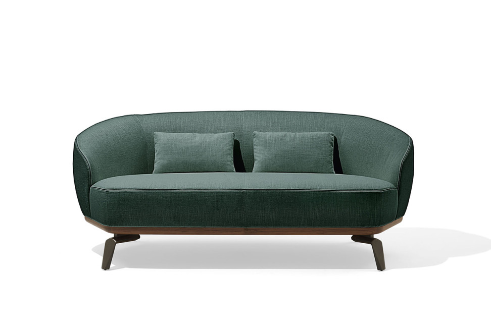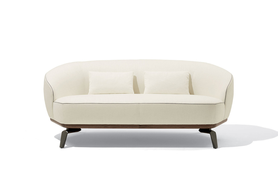 Le canapé Tamino de Giorgetti s'avère également extrêmement polyvalent, grâce à la possibilité de choisir non seulement la base, disponible dans la version à bande en noyer canaletto ou avec des pieds en métal, mais aussi le revêtement, uni ou bicolore en tissu ou en cuir.