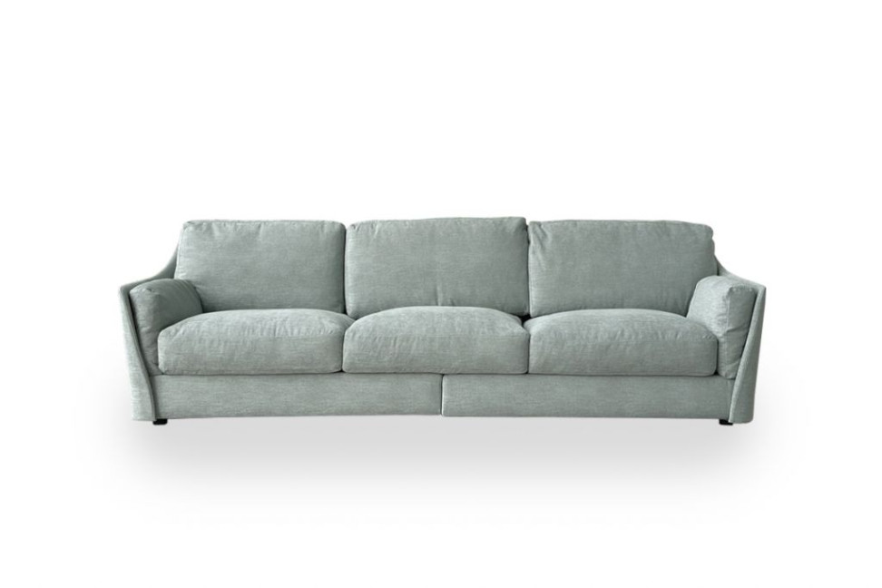Le canapé Vittoria en Offre Expo dans notre showroom est la version monochrome entièrement recouverte de tissu mélangé gris et vert d'eau, avec des pieds en hêtre.