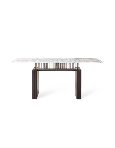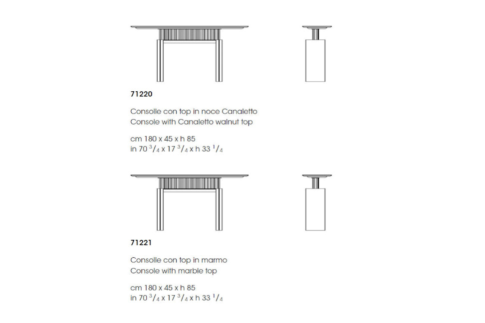 Le design des produits Giorgetti naît de la fusion de traditions centenaires, d'un savoir-faire artisanal et d'une attention particulière dans la sélection des matières premières. La consolle G-Code est disponible avec un plateau en marbre ou en noyer canaletto soutenu par une structure métallique, reposant sur des pieds en bois. Les pieds sont réglables et le mécanisme de réglage, intégré dans la structure, n'est pas visible.