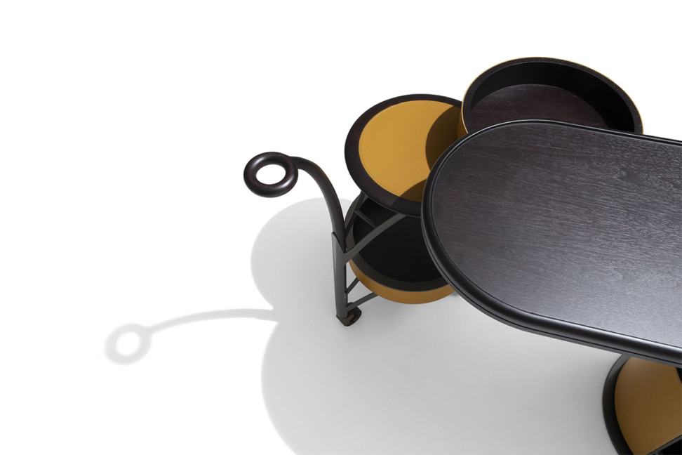 L'originalité de ce complément de mobilier réside dans le fait qu'il est composé de deux éléments, à savoir une colonne bar et un chariot, qui peuvent également être utilisés séparément si nécessaire. Les formes sont arrondies et les détails extrêmement soignés : la structure est en MDF recouvert de cuir et bordé en massif de noyer canaletto ; le plateau est en noyer canaletto et est rehaussé d'un insert circulaire en marbre. Le meuble bar Host est disponible dans les différentes finitions de la collection Giorgetti, tant pour les parties en bois que pour l'insert en marbre et pour le cuir du revêtement.