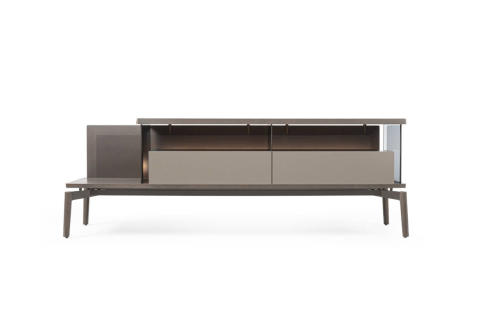 La meuble de rangement est disponible en deux versions caractérisées par une structure symétrique ou asymétrique, décalée vers la droite ou la gauche. Les deux versions sont disponibles avec une base en métal peint finition pewter et des pieds en métal peint finition pewter et en bois massif de frêne dans différentes finitions, ou avec une base de h 30 mm en frêne, dans diverses finitions. Dans toutes les versions, le plateau est disponible en frêne ou en marbre et en cuir.