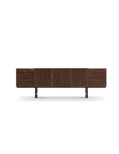 Malgré l'extrême simplicité formelle de la structure, constituée d'un parallélépipède surélevé par une fine base en métal, la savante combinaison des différents matériaux enrichit ce complément de mobilier, lui conférant une allure sophistiquée et raffinée.