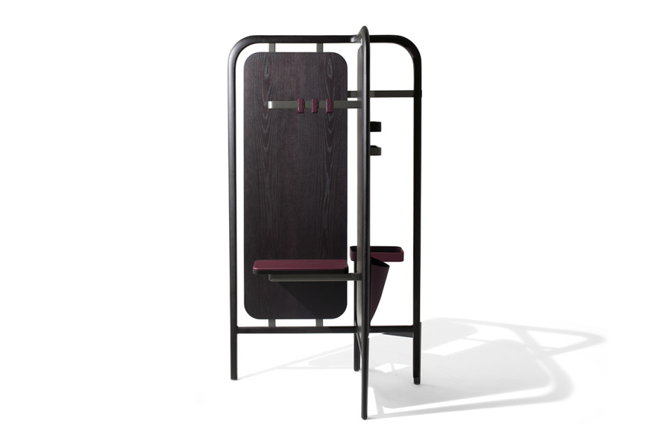 Cette intéressante solution d'aménagement repose sur une structure en bois (disponible en plusieurs finitions) avec deux panneaux en MDF, l'un avec miroir et l'autre recouvert de cuir. Amiral de Giorgetti est accompagné d'une série d'accessoires, comme un plateau en cuir et une coupelle vide-poches en cuir, mais aussi des crochets en métal recouverts de cuir.