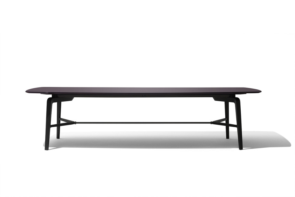 La table Blade de Giorgetti, disponible en différentes tailles, est entièrement réalisée en bois massif, avec une base en frêne et un plateau rectangulaire en bois ou dans la finition laquée brillante particulière avec effet dégradé, qui confère une touche originale à cet élément de mobilier.