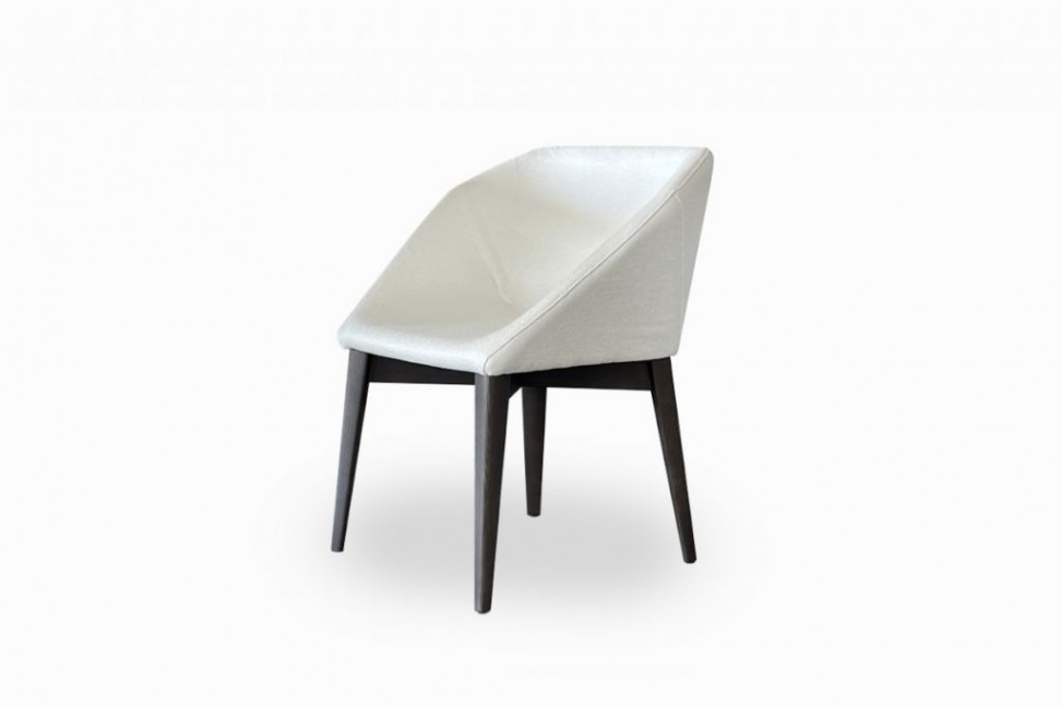La chaise W-Hexagon de Henge en offre Expo dans notre showroom est dotée d'une base en bois de hêtre avec finition en eucalyptus noir; l'assise est entièrement recouverte d'un tissu de couleur blanc sale.