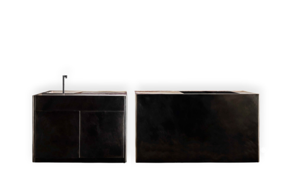 Oxygen est une île de cuisine conçue par Massimo Castagna en collaboration avec Henge. Son design élégant et percutant se caractérise par des blocs monolithiques qui unissent la pierre et une structure revêtue de métal précieux.