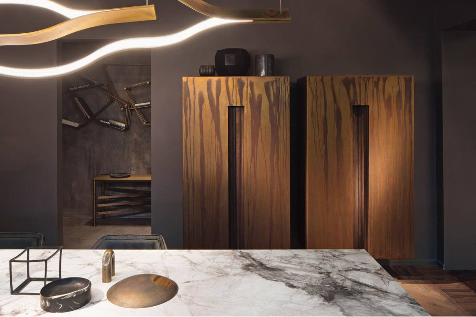 Le meuble de rangement Frame, de Massimo Castagna pour Henge, est caractérisé par une structure en bois de chêne thermo-traité avec des détails métalliques en laiton brunie à la main ; le socle est en acier avec une finition en laiton brunie et les étagères sont en verre trempé bronzé. Le contenant Frame est disponible à la fois en version standard et en version bar mobile et peut être équipé de plateaux optionnels.