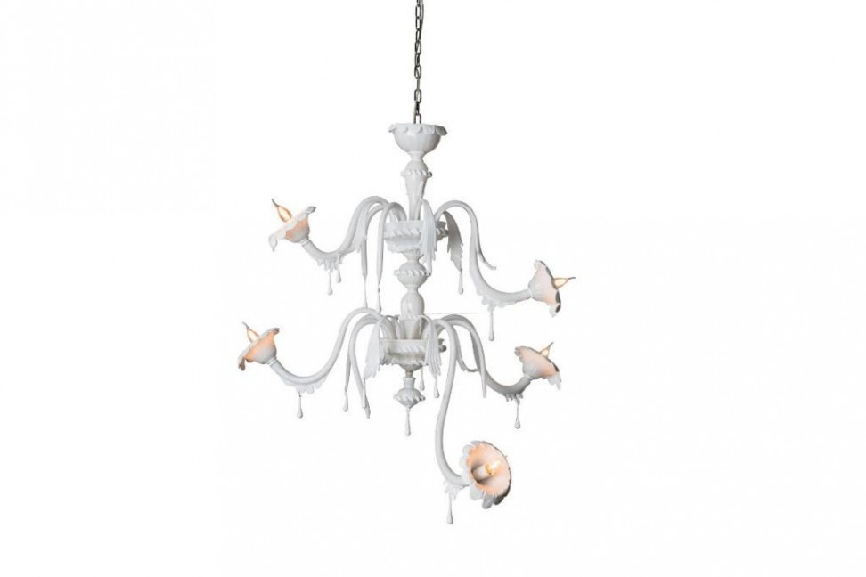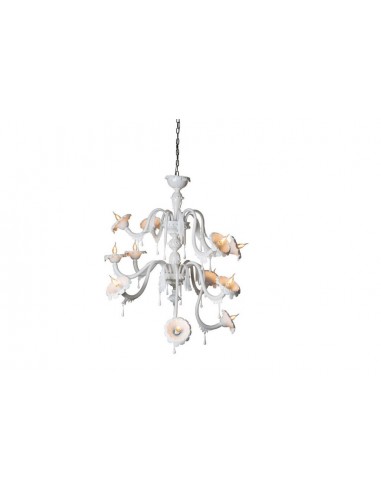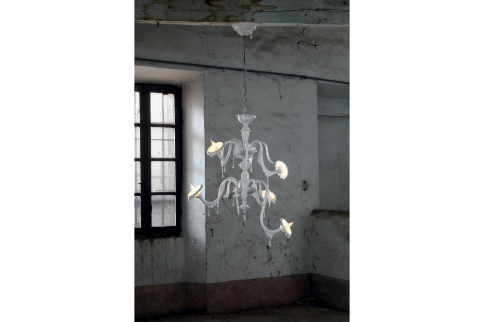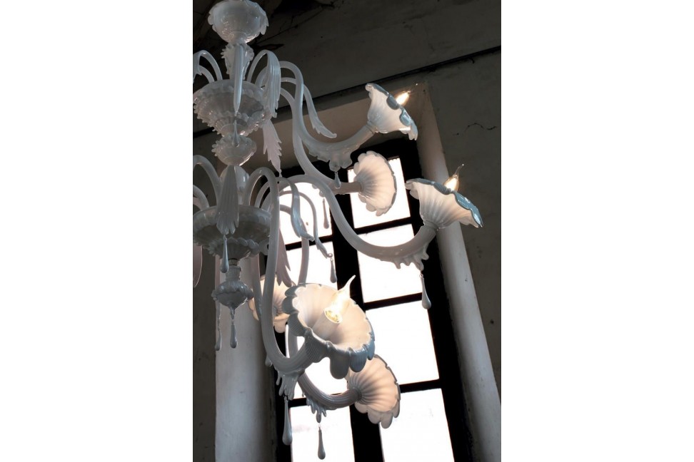 Composé de modules individuels de différentes formes et tailles, ce complément de mobilier original est l'un des produits les plus particuliers parmi les collections de l'entreprise. La lampe prend forme grâce à l'union des divers éléments combinés de manière à obtenir une composition personnelle et unique, dont la forme s'inspire de la tradition verrière d'autrefois. La structure en verre blanc opalin est constituée de bras sinueux au style floral qui semblent se fondre avec la chaleur émise par la lumière, comme la cire d'une bougie, presque pour immortaliser le cours des choses.